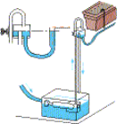 Überlaufwasser fließt in den Tiefbehälter zurück. Behälter und Rinnen lassen sich auch ohne zusätzlichen Überlaufbehälter auf ein einstellbares Niveau befüllen, indem in ersteren ein Überlaufrohr höheneinstellbar befestigt wird, welches mit dem Tiefbehälter zu verbinden ist.