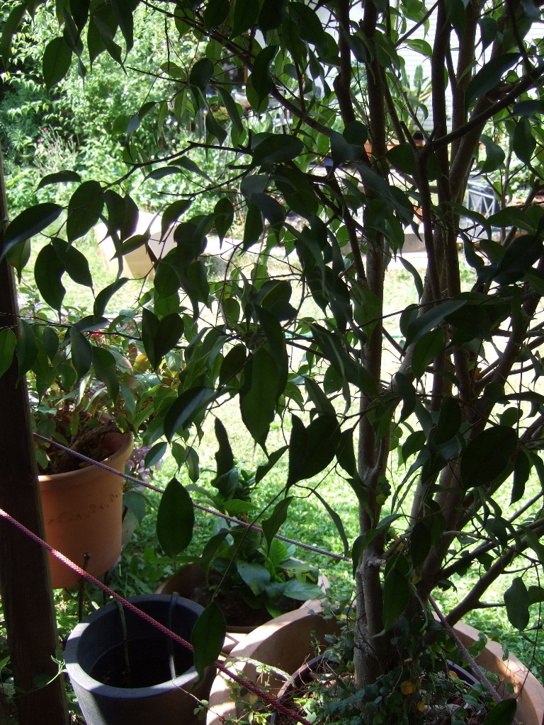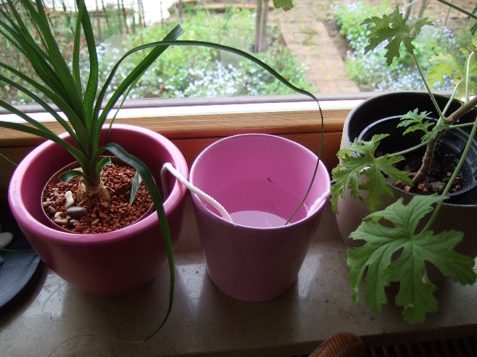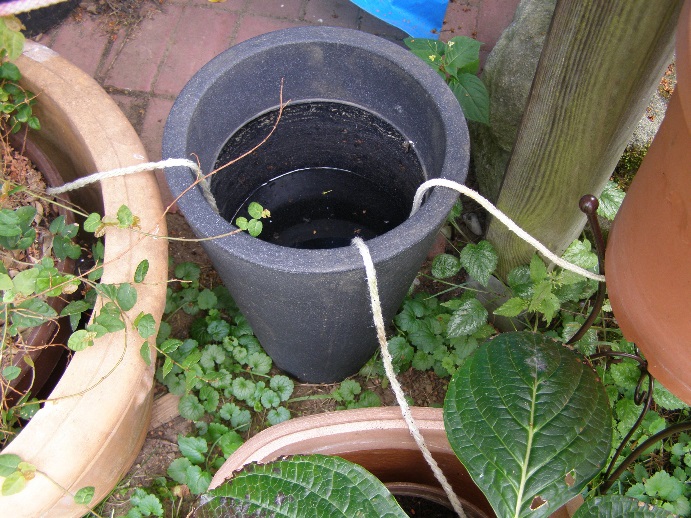 Zwei Pflanzen, ein ca. 2 m hoher Ficus und eine Hortensie, die auf dem Boden standen und eine Fuchsie, die erhöht auf einen Ständer stand und über die Kordel versorgt werden sollte. Bei den beiden erstgenannten Pflanzen wurden die Bewässerungsschnüre über die Ränder der Töpfe gelegt und die Schnüre an der Topf-Innenseite im Pflanzensubstrat nach unten geführt. Die Pflanzen wurden danach noch einmal kräftig gegossen und wurden dann weitgehend über die Bewässerungsschnur versorgt. Bei der Fuchsie wurde die Schnur vom Wasserreservoir von unten in den Pflanztopf eingeführt und ca. 10 cm im Pflanzsubstrat noch oben geführt. Der Topfunterboden war ungefähr auf gleicher Höhe wie die Ober-kannte des Wasserbehälters. Für ca. 5 Wochen (mit entsprechenden Niederschlägen) konnte die Pflanze gut versorgt werden, da der Wasserstand jedoch in der Zeit sank und sich dadurch die zu überwindende Höhe auf ca. 30 cm erhöhte, war der Wassertransport nicht mehr ausreichend gewährleistet.
