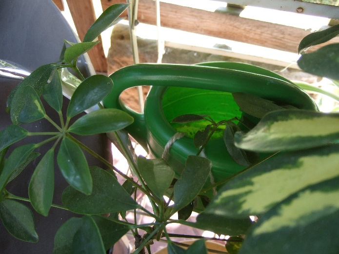 Obwohl die Schnüre zum Blumenkasten und zur Topfpflanze immer nass waren, wurden die Pflanzen nur unzureichend versorgt. Die Schnur zum Untersetzer war die meiste Zeit trocken. Zurückzuführen ist dies aber wohl hauptsächlich darauf, dass zu sämtlichen Pflanzen nicht genügend Wurzelkontakt mit den Dochten bestand, deshalb wurde zunächst noch mit der Gießkanne zusätzlich gegossen und dabei die Gießabstände immer weiter vergrößert. Während der Hitzeperiode stellten wir aber fest, dass sämtliche Schnüre fast ausgetrocknet waren. Wir änderten daher die Versuchsanordnung, indem wir eine gefüllte Gießkanne auf die mittlere Etage des Blumenregals stellten und die Dochte dort hineinsteckten. Da der Blumenkasten mit der Kletterpflanze in ca. 40 cm Entfernung mit einem Höhenunterschied von ca. 20 cm stand, haben wir die experimentelle Musterschnur noch mit einzelnen Folienstücken ummantelt um diese so vor Austrocknung zu schützen. Der Boden der Gießkanne steht nun auf gleicher Höhe, wie der Untersetzer mit den Topfpflanzen. Der große Übertopf steht eine Etage tiefer. Diese Anordnung ist jetzt um ein vielfaches besser, zwar mussten wir durch die Aktion auf eine Blüte der Wachsblume in diesem Jahr verzichten, doch jetzt wurden sämtliche Pflanzen ausreichend versorgt.
