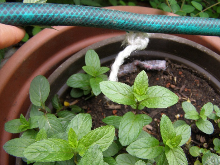 Neben einen kleinen Miniteich in einer Zinkwanne steht unsere Pfefferminzpflanze im Topf und daneben ist ein alter Futtertrog, der als Blumentrog verwendet wird. Da beide Pflanzgefäße kein Wasserreservoir besitzen wollten wir diese mit Hilfe der experimentellen Musterschnur mit dem Wasserspeicher der Zinkwanne verbinden um die Pflanzen so bei heißen Tagen oder Kurzurlauben sich selbst zu überlassen. Dazu verlegten wir in der Mitte des Pflanztrogs in ca. 15 cm Tiefe die Musterschnur über Rand des Pflanztroges und Zinkwanne hinweg direkt bis auf den Boden der Wanne. Die dazwischen stehende Pfefferminzstaude wurde dahingehend angeschlossen, dass wir ein Reststück der Schnur mit der anderen „Glasfaserleitung“ verknoteten. Um die Schnur selbst und auch uns vor evt. Glasfasersplittern zu schützen schnitten wir einen Schlauch auf und umhüllten damit die "offene Leitung".