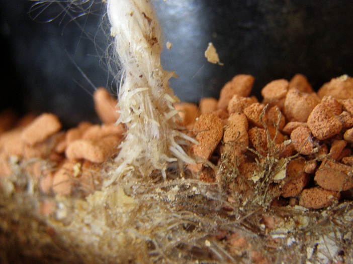 Nach 2 Tagen mussten wir feststellen, dass lediglich der Glasfaserdocht den gewünschten Effekt zeigte. Bei der Bewässerung mit der Kordel wurde zu viel Wasser gezogen und die Pflanze stand ca. 5 cm hoch im Wasser. Die Pflanze mit dem Glasfaserdocht hingegen wurde für 3 Wochen optimal versorgt, danach stockte die Wasserzufuhr etwas, was vermutlich durch Sonneneinstrahlung auf die Schnur ausgelöst wurde. Dabei wurde offensichtlich in diesem Bereich zu viel Wasser verdunstet. Außerdem war der Glasfaserdocht leicht am veralgen. Abhilfe schafften wir, indem wir einen Strohhalm der Länge nach aufschnitten und um den Docht legten. Der Übertopf, der als Wasserspeicher diente wurde provisorisch mit einem Teller abgedeckt. Nachdem der Übertopf wieder mit Wasser aufgefüllt wurde, funktionierte die Bewässerung wieder einwandfrei. Über 4 Wochen konnte sich so die Pflanze (am Westfenster) über den Übertopf, der ca. 1 Liter Wasser fasste, eigenständig versorgen.