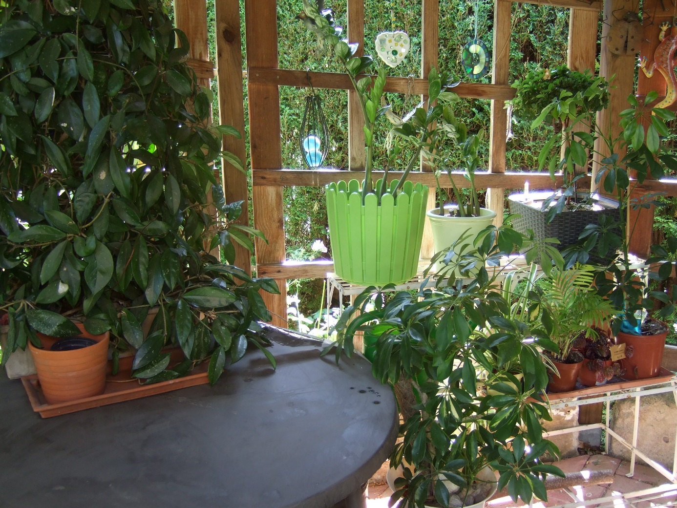 Dazu haben wir unsere Kletterpflanze (Wachsblume) im Blumenkasten auf einem Tisch unserer schattigen Laube gestellt. Daneben befindet sich ein Blumenregel, in der mittleren Etage stehen einige Topfpflanzen auf einer Bewässerungsmatte in einen Pflanzkasten Untersetzer und in der untersten Etage steht eine große Schefflera, die direkt in einen Übertopf gepflanzt ist. Alle Pflanzen wurden bisher immer nur von oben gegossen. Unter dem Tisch wurde zunächst ein großes Wassergefäß aufgestellt. Abstand Wasseroberfläche zur Wachsblume 45 cm-80 cm. Der Untersetzer war ungefähr in Höhe der Oberkante des Wassergefäßes und wurde mit einer 2mm Glasfaserdochtschnur versorgt. Für die beiden anderen Gefäße wurde die 6 mm Schnur verwendet. Diese wurde in Höhe der Oberkante des Wasserspeichers aufgedreht und damit geteilt - 4 mm zum Blumenkasten und 2 mm zum Blumentopf, der leicht erhöht (5 cm) direkt neben dem Wassergefäß stand.