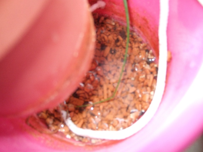 Wir haben einen Versuch mit 2 Zimmerpflanzen gestartet. Beide Zimmerpflanzen waren in einem Plastiktopf gepflanzt und standen in einem Übertopf, in dem sich noch eine ca. 2-3 cm hohe Schicht Tongranulat befand. Die Wurzeln sind dabei schon in das Granulat gewachsen. So konnten wir die beiden Bewässerungsschnüre einfach unter das Granulat legen. In die Mitte kam ein weiterer Übertopf, der mit Wasser gefüllt wurde. Eine Pflanze wurde dabei mit einem Glasfaserdocht versehen und die andere Pflanze mit einer Kordel aus unbekanntem Material.
