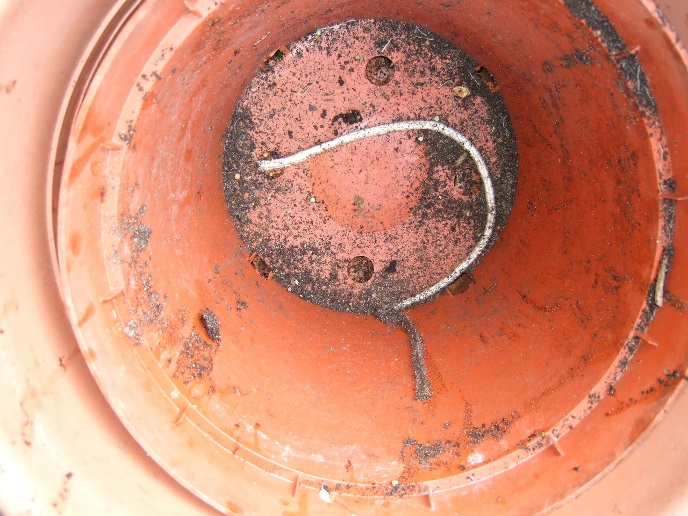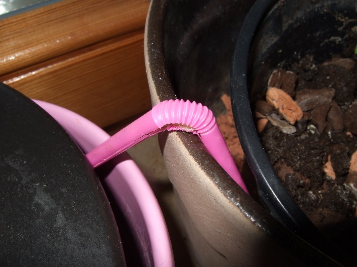 Nach 2 Tagen mussten wir feststellen, dass lediglich der Glasfaserdocht den gewünschten Effekt zeigte. Bei der Bewässerung mit der Kordel wurde zu viel Wasser gezogen und die Pflanze stand ca. 5 cm hoch im Wasser. Die Pflanze mit dem Glasfaserdocht hingegen wurde für 3 Wochen optimal versorgt, danach stockte die Wasserzufuhr etwas, was vermutlich durch Sonneneinstrahlung auf die Schnur ausgelöst wurde. Dabei wurde offensichtlich in diesem Bereich zu viel Wasser verdunstet. Außerdem war der Glasfaserdocht leicht am veralgen. Abhilfe schafften wir, indem wir einen Strohhalm der Länge nach aufschnitten und um den Docht legten. Der Übertopf, der als Wasserspeicher diente wurde provisorisch mit einem Teller abgedeckt. Nachdem der Übertopf wieder mit Wasser aufgefüllt wurde, funktionierte die Bewässerung wieder einwandfrei. Über 4 Wochen konnte sich so die Pflanze (am Westfenster) über den Übertopf, der ca. 1 Liter Wasser fasste, eigenständig versorgen.
