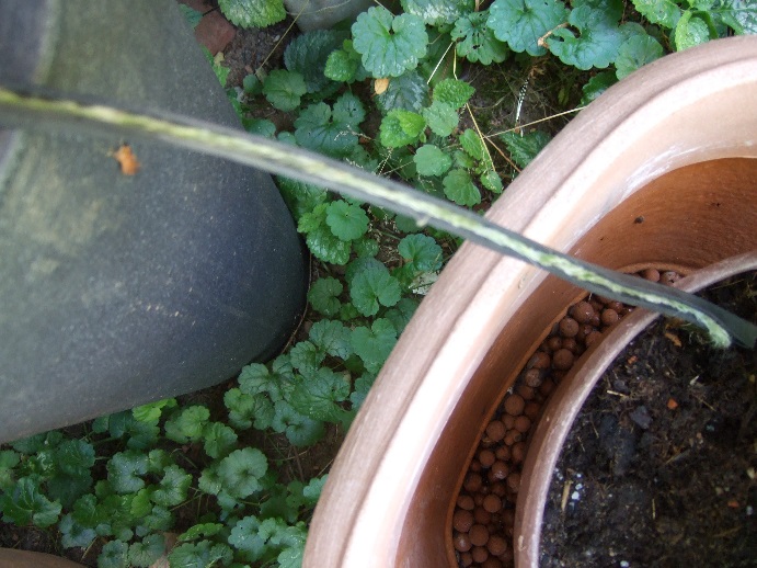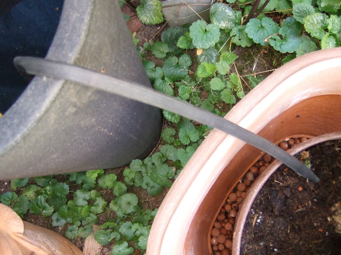 Zwei Pflanzen, ein ca. 2 m hoher Ficus und eine Hortensie, die auf dem Boden standen und eine Fuchsie, die erhöht auf einen Ständer stand und über die Kordel versorgt werden sollte. Bei den beiden erstgenannten Pflanzen wurden die Bewässerungsschnüre über die Ränder der Töpfe gelegt und die Schnüre an der Topf-Innenseite im Pflanzensubstrat nach unten geführt. Die Pflanzen wurden danach noch einmal kräftig gegossen und wurden dann weitgehend über die Bewässerungsschnur versorgt. Bei der Fuchsie wurde die Schnur vom Wasserreservoir von unten in den Pflanztopf eingeführt und ca. 10 cm im Pflanzsubstrat noch oben geführt. Der Topfunterboden war ungefähr auf gleicher Höhe wie die Ober-kannte des Wasserbehälters. Für ca. 5 Wochen (mit entsprechenden Niederschlägen) konnte die Pflanze gut versorgt werden, da der Wasserstand jedoch in der Zeit sank und sich dadurch die zu überwindende Höhe auf ca. 30 cm erhöhte, war der Wassertransport nicht mehr ausreichend gewährleistet.